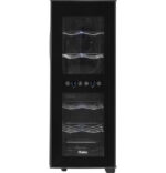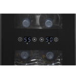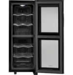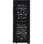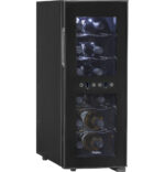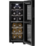 This 12-bottle wine cellar features an ultra-quiet, vibration-free thermoelectric cooling system to preserve wine flavor without noise disturbance. With dual temperature zones, it allows you to store both red and white wines at ideal temperatures—54–66°F in the upper zone and 42–66°F in the lower zone. Its sleek design includes a curved door with smoked glass and black trim, adding a modern touch to any room. The unit comes with four full-width chrome racks for secure bottle storage and soft interior lighting for easy viewing. Dual touchscreen controls with LED displays make adjusting temperatures simple and intuitive. Its compact size fits well in kitchens, bars, or small spaces, while energy-efficient thermoelectric technology reduces power use without sacrificing performance. Stylish, functional, and quiet, it’s perfect for wine lovers with limited space.