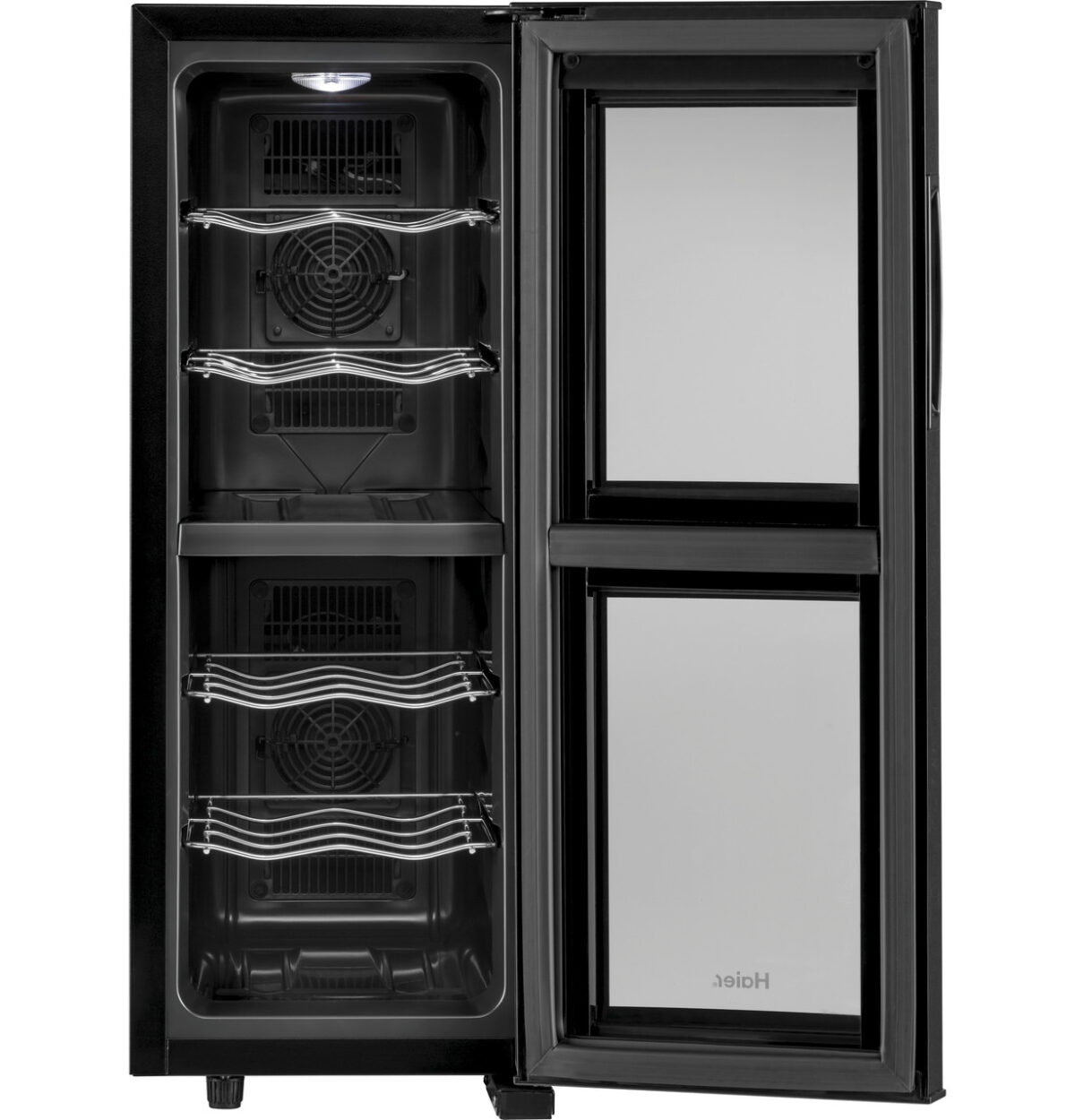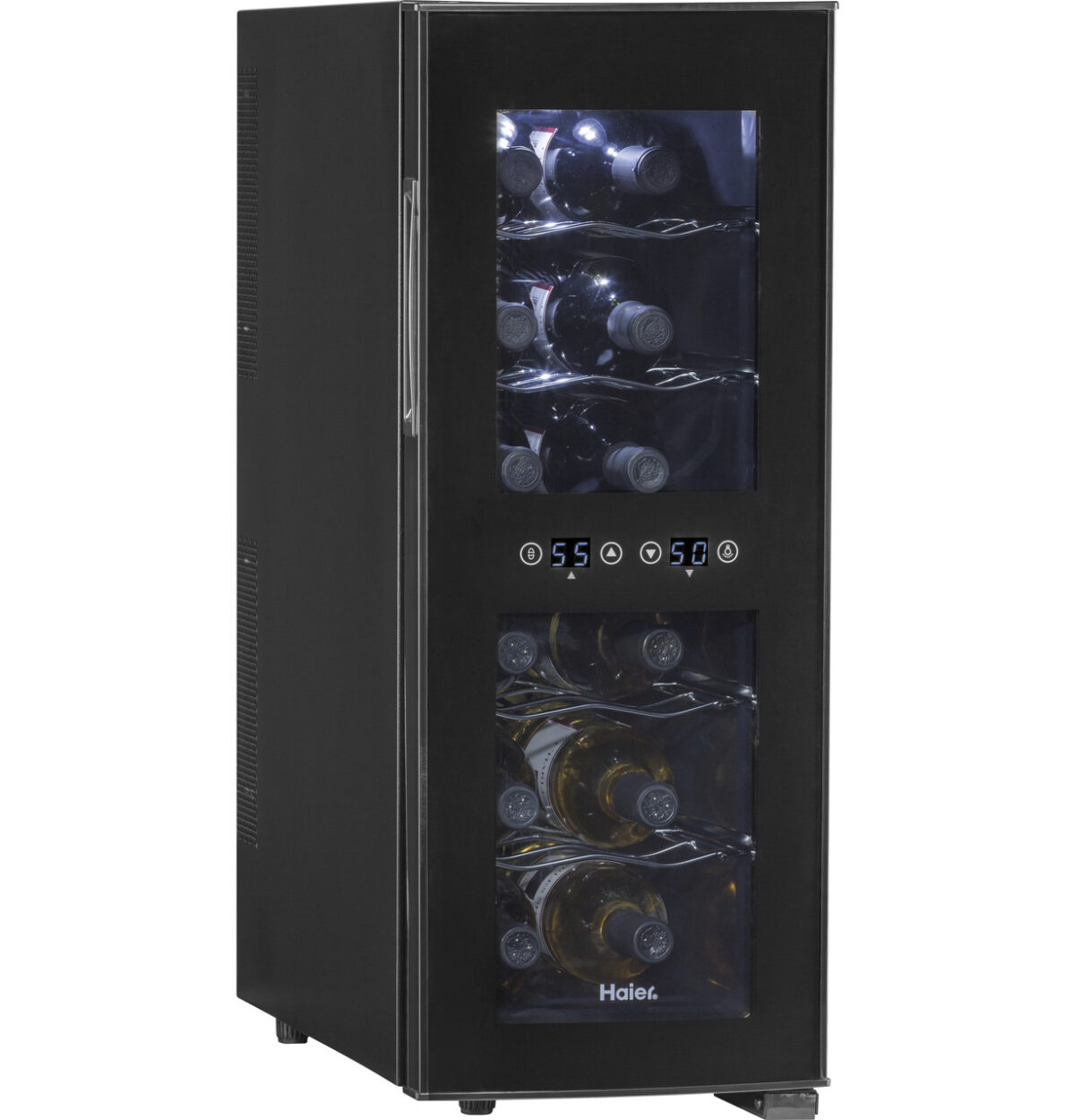 This 12-bottle wine cellar features an ultra-quiet, vibration-free thermoelectric cooling system to preserve wine flavor without noise disturbance. With dual temperature zones, it allows you to store both red and white wines at ideal temperatures—54–66°F in the upper zone and 42–66°F in the lower zone. Its sleek design includes a curved door with smoked glass and black trim, adding a modern touch to any room. The unit comes with four full-width chrome racks for secure bottle storage and soft interior lighting for easy viewing. Dual touchscreen controls with LED displays make adjusting temperatures simple and intuitive. Its compact size fits well in kitchens, bars, or small spaces, while energy-efficient thermoelectric technology reduces power use without sacrificing performance. Stylish, functional, and quiet, it’s perfect for wine lovers with limited space.
