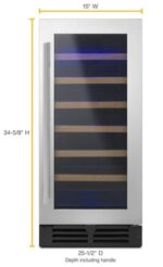 This 15″ undercounter wine center provides storage for up to 34 bottles of red or white wine. It features custom temperature selection, allowing you to store wine at your preferred settings for optimal aging or serving conditions. The sleek design includes LED interior lighting, making it easy to view and select bottles without opening the door. The towel bar handle adds a modern touch and ensures the wine center blends effortlessly into your kitchen’s design. Its compact size and stylish features make it a perfect addition to any kitchen or home bar setup.