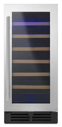 This 15″ undercounter wine center provides storage for up to 34 bottles of red or white wine. It features custom temperature selection, allowing you to store wine at your preferred settings for optimal aging or serving conditions. The sleek design includes LED interior lighting, making it easy to view and select bottles without opening the door. The towel bar handle adds a modern touch and ensures the wine center blends effortlessly into your kitchen’s design. Its compact size and stylish features make it a perfect addition to any kitchen or home bar setup.