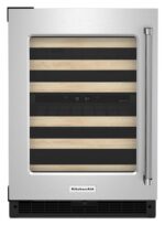 24″ Undercounter Wine Cellar with Glass Door and Wood-Front Racks. This Undercounter Wine Cellar with Full-Extension Wood-Front Racks holds up to 46 standard Bordeaux-size bottles. Two Temperature-Controlled Zones let you separate reds and whites to store each at the temperature you enjoy, and Motion-Activated LED Lighting turns on as you approach, making it easy to see what’s inside. Fully Flush Installation with Hidden Hinges provides a built-in look within cabinetry.