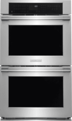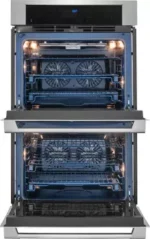 The 30″ Electric Double Wall Oven delivers ultimate convenience with advanced features to enhance your cooking experience. Its Perfect Taste Dual Convection system uses two fans with adjustable speeds to ensure even heat circulation for baking, broiling, roasting, and slow cooking. A temperature probe alerts you when the preset temperature is reached and automatically switches to Keep Warm mode. The oven boasts a signature cobalt blue interior, Smooth-Glide ball bearing racks, and a porcelain broiling pan and grill, all safe for the self-cleaning cycle. With a spacious 4.8 cu. ft. capacity in both ovens, you can cook multiple dishes at different settings. Additional features include defrosting, dehydrating, proofing dough, delay baking, and rapid preheat. The self-cleaning cycle has light, medium, and heavy settings. It’s backed by a 3-year parts warranty and a 1-year labor warranty.