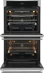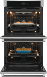 This 30″ Electric Double Wall Oven offers advanced cooking technology with features like Air Sous Vide, delivering precise heat and airflow for sous vide-style results—no water bath needed. Steam Bake & Roast enhances natural flavors, creating crispy, juicy meals. With Built-In Air Fry, enjoy healthier versions of your favorite fried foods using less oil. The powerful convection system ensures even cooking across all racks. Full-Color Touch Controls make operation simple and intuitive, while the No Preheat feature saves time. A 30-Minute Steam Clean cycle keeps your oven fresh without harsh chemicals. Additional highlights include a Temperature Probe for perfect doneness, Luxury-Glide Oven Racks for smooth handling, and Bread Proof and Dehydrate modes for added versatility. Perfect for home chefs seeking performance, convenience, and flavor.
