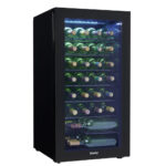 The 36 Bottle Free-Standing Wine Cooler in Black is the perfect solution for wine enthusiasts who need space and style. With a 36-bottle capacity, it offers ample room for your collection. The sleek black wire shelving provides an elegant display, while the blue LED lighting illuminates your wines through a tempered-glass door, which also protects them from harmful UV rays. The cooler’s temperature is adjustable between 43°F and 57°F (6°C to 14°C), keeping your wines at the perfect temperature. A discreet pocket-style handle and smooth back design allow it to sit flush against the wall, while the reversible door offers flexibility. It also includes a 12-month warranty on parts and labor with in-home service for added peace of mind.