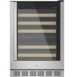 The 44-Bottle Dual Zone Wine Cooler combines modern design with functionality, featuring a sleek glass door with stainless steel trim and handle, complementing any kitchen décor. It offers dual-zone temperature control, keeping red and white wines at ideal serving temperatures from 43ºF to 62ºF. Six sliding racks with wooden fronts allow easy access to bottles, while recessed LED lighting ensures clear visibility. Designed for both built-in and freestanding installation, it fits seamlessly into any space. The cooler features a 44-bottle capacity, a triple-pane glass door for enhanced temperature stability and energy efficiency, and digital controls for precise adjustments. The tinted glass door and door alarm prevent energy waste, while power buttons make it easy to operate the unit and lighting, ensuring both convenience and efficiency.